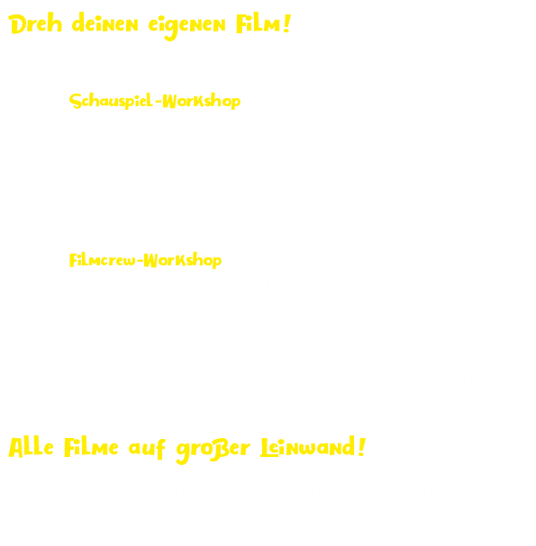 Eine Woche intensiv in die Welt des Filmemachens einsteigen. Wir produzieren innerhalb einer Woche einen Kurzfilm für die große Leinwand!